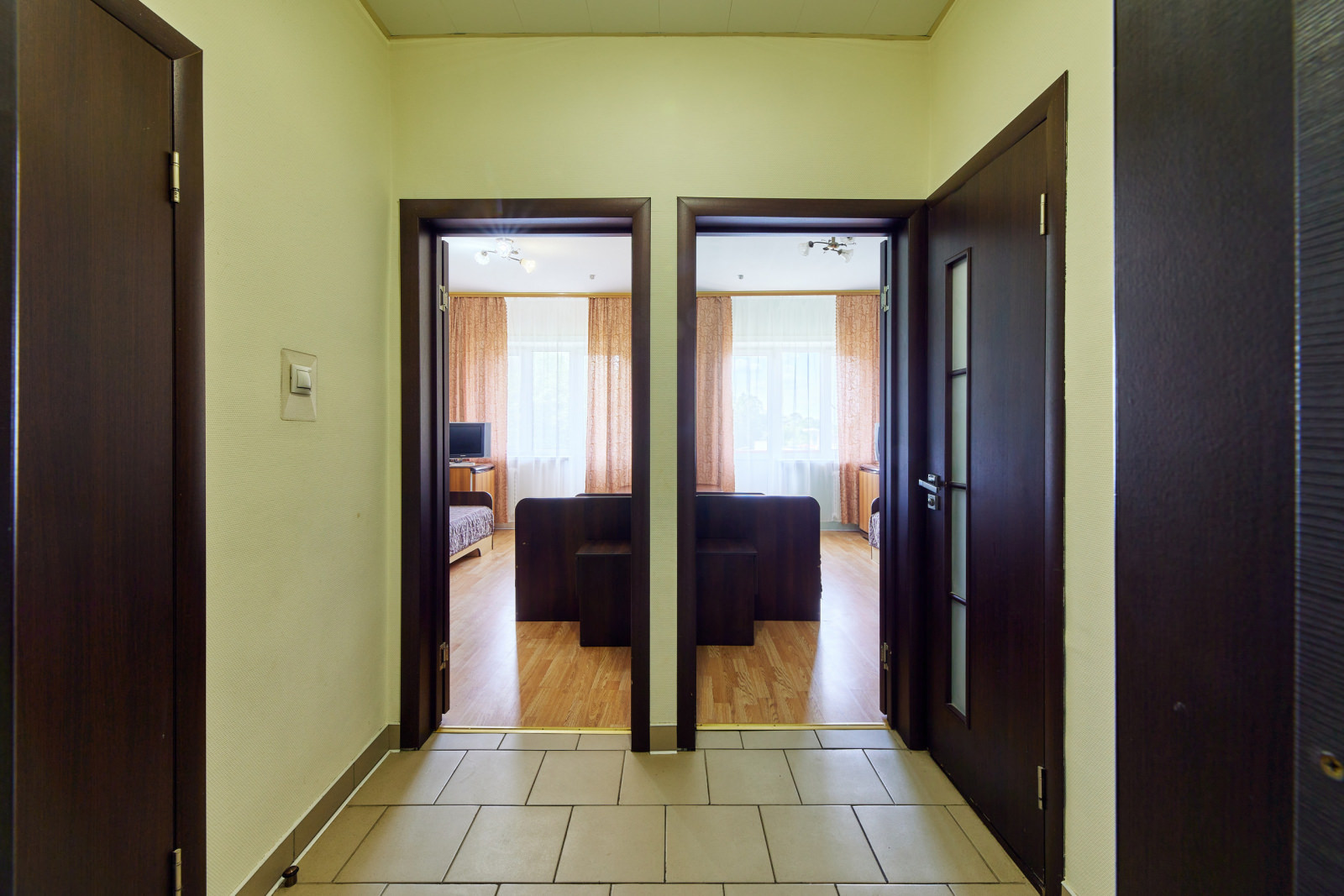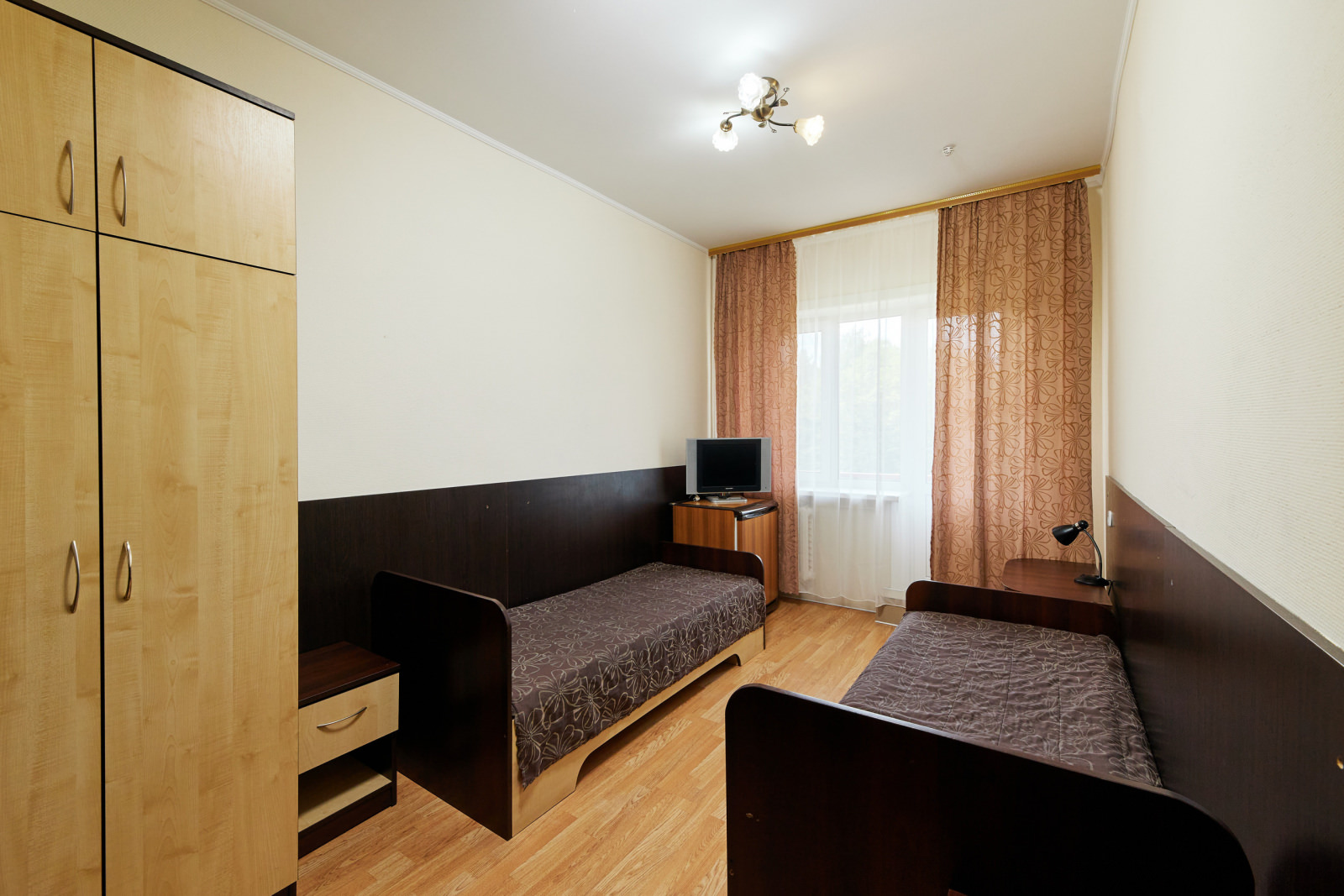 2 осн. места. 1 доп. место. Мебель: вешалка, зеркало, кровати односпальные, прикроватные тумбочки, шкаф. Оборудование: телевизор, холодильник. Санузел на блок. Сервис: смена полотенец, смена постельного белья, уборка номера.