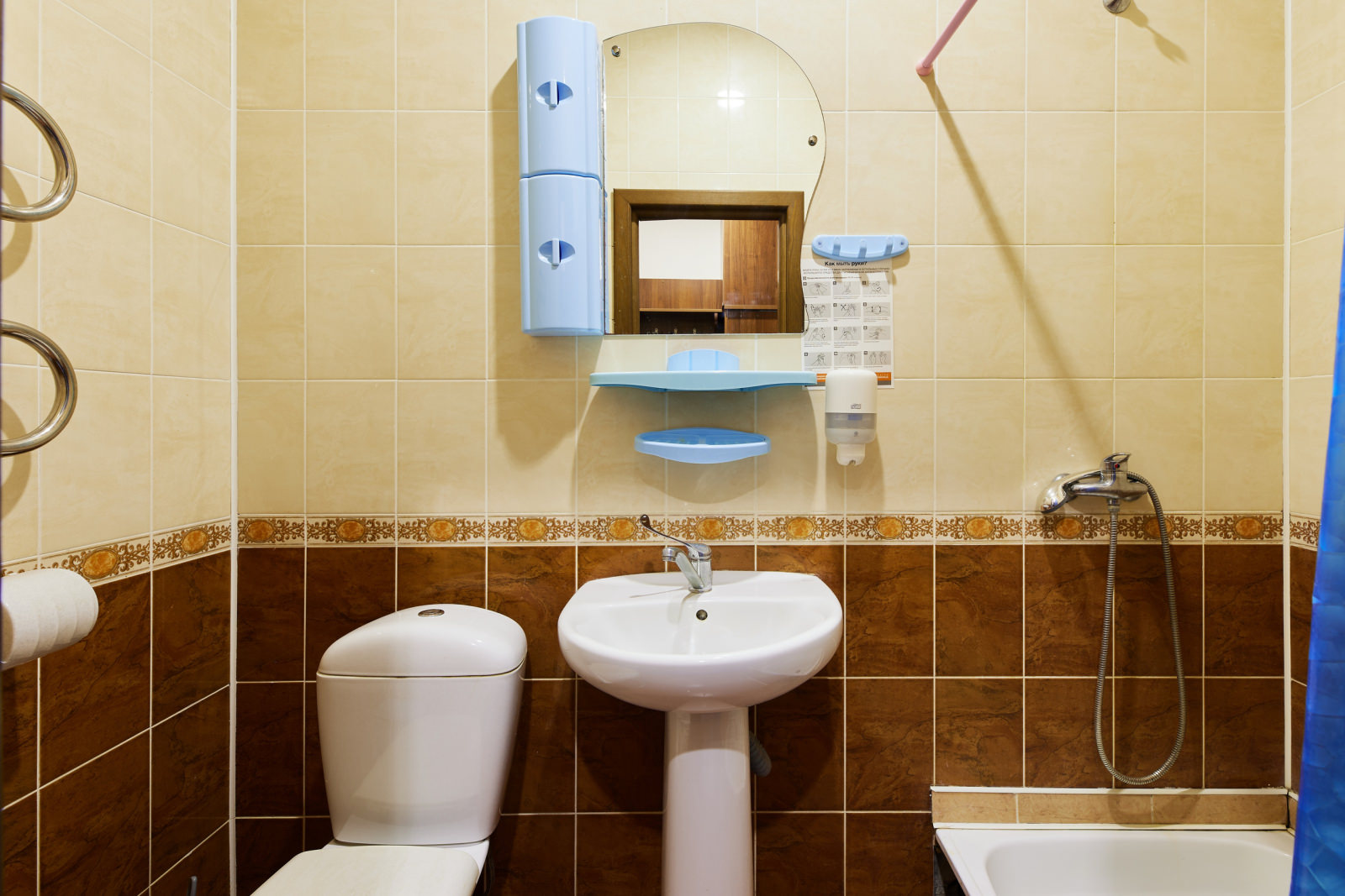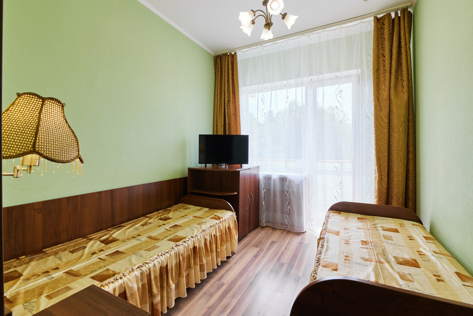 2 осн. места. 1 доп. место. Мебель: вешалка, зеркало, кровати односпальные, прикроватные тумбочки, стулья, шкаф. Оборудование: набор посуды, телевизор, холодильник, чайный набор посуды, электрочайник. Санузел: с душем, туалетные принадлежности. Сервис: смена полотенец, смена постельного белья, уборка номера.